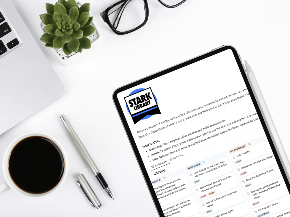 Stark Library is, to my knowledge, the most varied collection of knowledge and inspiration in the form of a digital library. You could treat is as your bottomless reading/watch list. It has thousands of links (and growing), organised by topic and format.