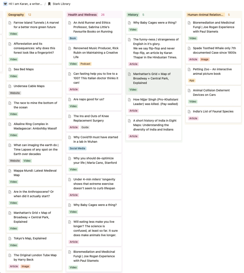 Stark Library is, to my knowledge, the most varied collection of knowledge and inspiration in the form of a digital library. You could treat is as your bottomless reading/watch list. It has thousands of links (and growing), organised by topic and format.