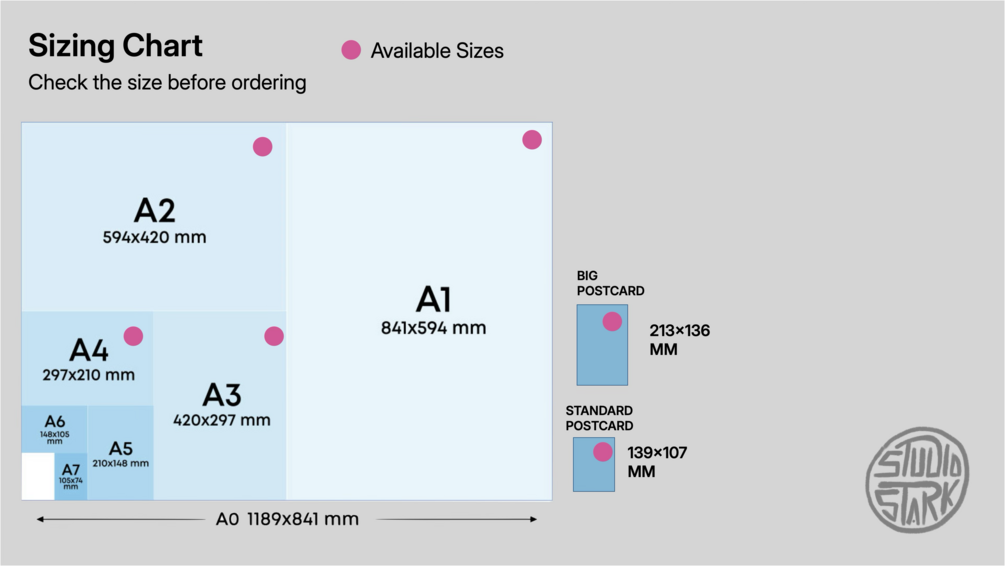 You can choose from the options of sizes available. The frame is not included, the print will be done on a 279 or above GSM premium paper.