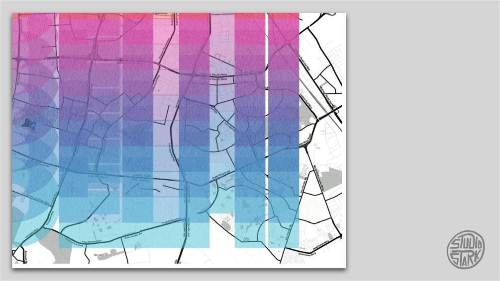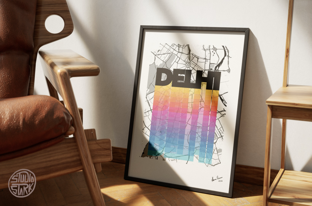 This is a Stylised Lettering Print for with Delhi written on a map of Delhi with multiple colours dropping out of the Lettering